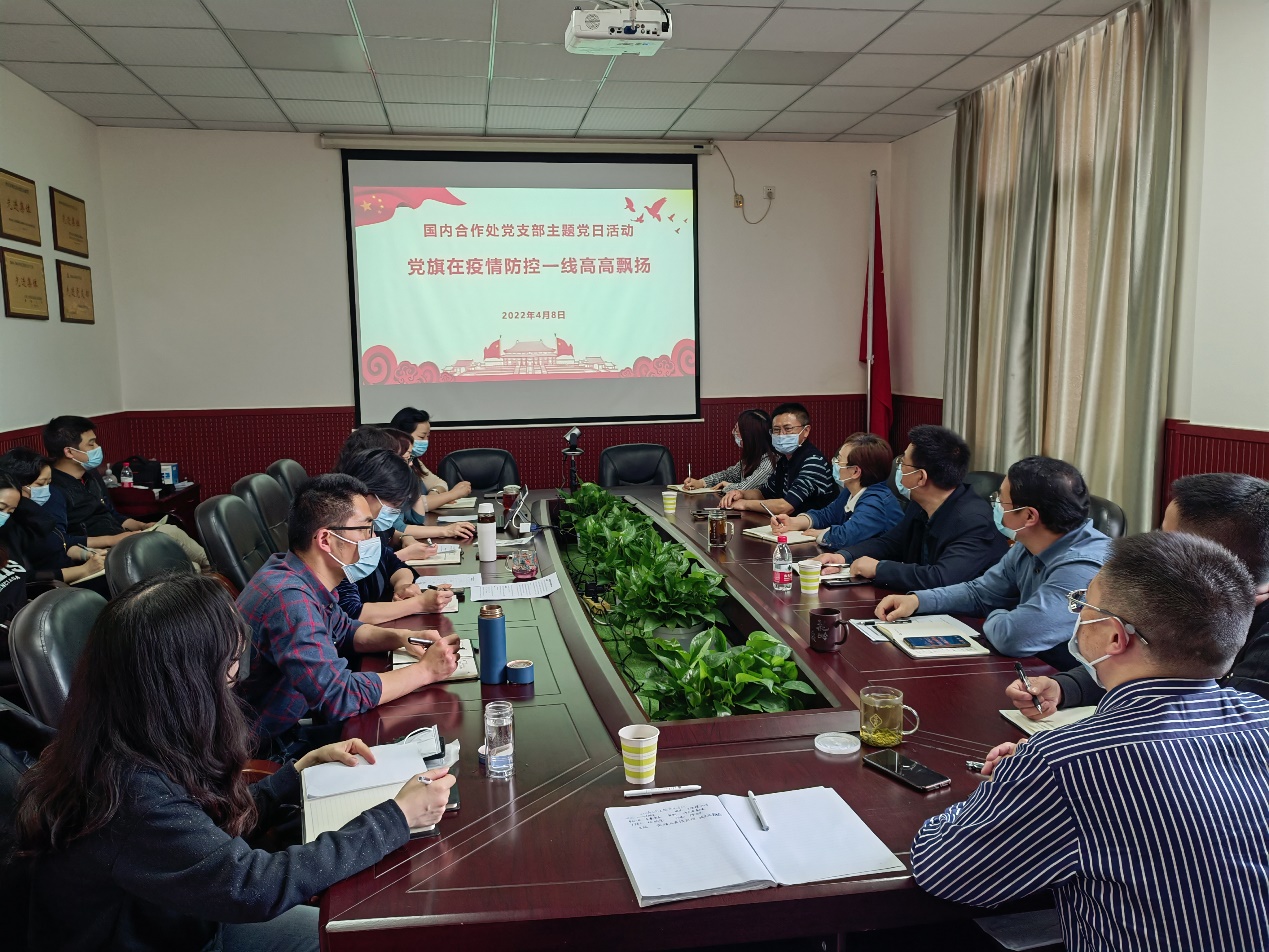 2022年4月8日下午,国内合作处党支部组织开展了主题为“党旗在疫情防控一线高高飘扬”的党日活动,支部副书记杨明厚主持会议。
