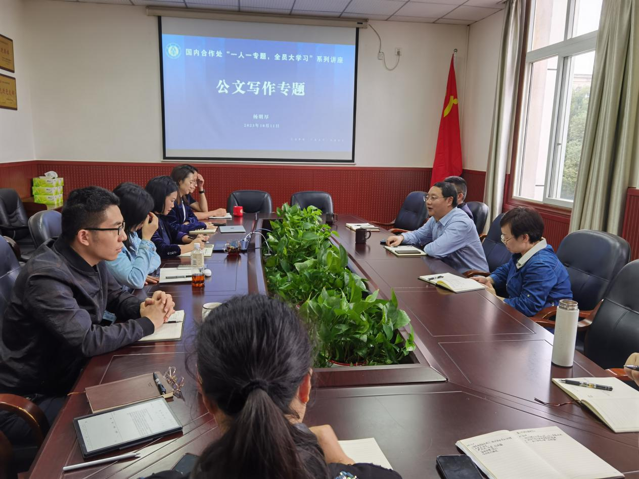 会上,杨明厚还结合国内合作处开展的“一人一专题,全员大学习”活动,为大家讲授了公文写作专题讲座,组织大家学习了《党政机关公文处理工作处例》和《西南大学公文处理办法》,对进一步规范公文处理流程、提升公文写作水平提出了具体的要求。
