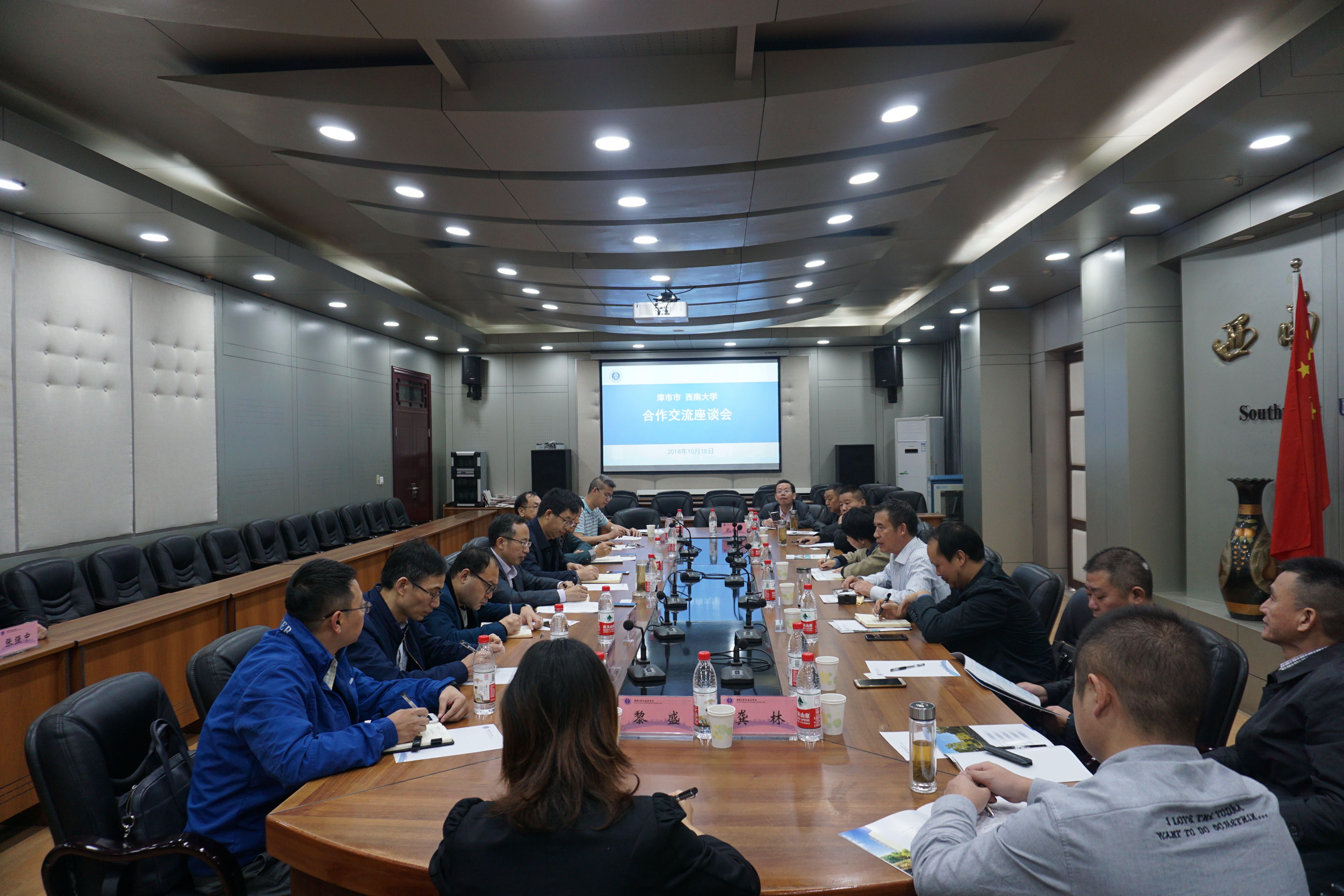 2018年10月18日,湖南津市市人大常委会主任王育平、副市长杜强等一行来校考察交流,洽谈市校合作相关事宜。校地合作处处长程龙、副处长丁增富,食品科学学院院长赵国华、副院长张宇昊及相关专家参加座谈交流。