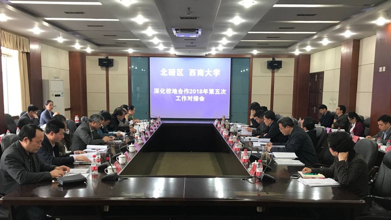 2018年10月26日,学校与北碚区在区行政中心召开深化校地合作2018年第五次工作对接会。区委书记周旭、西南大学校长张卫国出席会议并讲话,区长何庆,区委常委、常务副区长徐运征,副区长赵祺、陈德川,西南大学副校长丁忠民、周常勇出席会议。