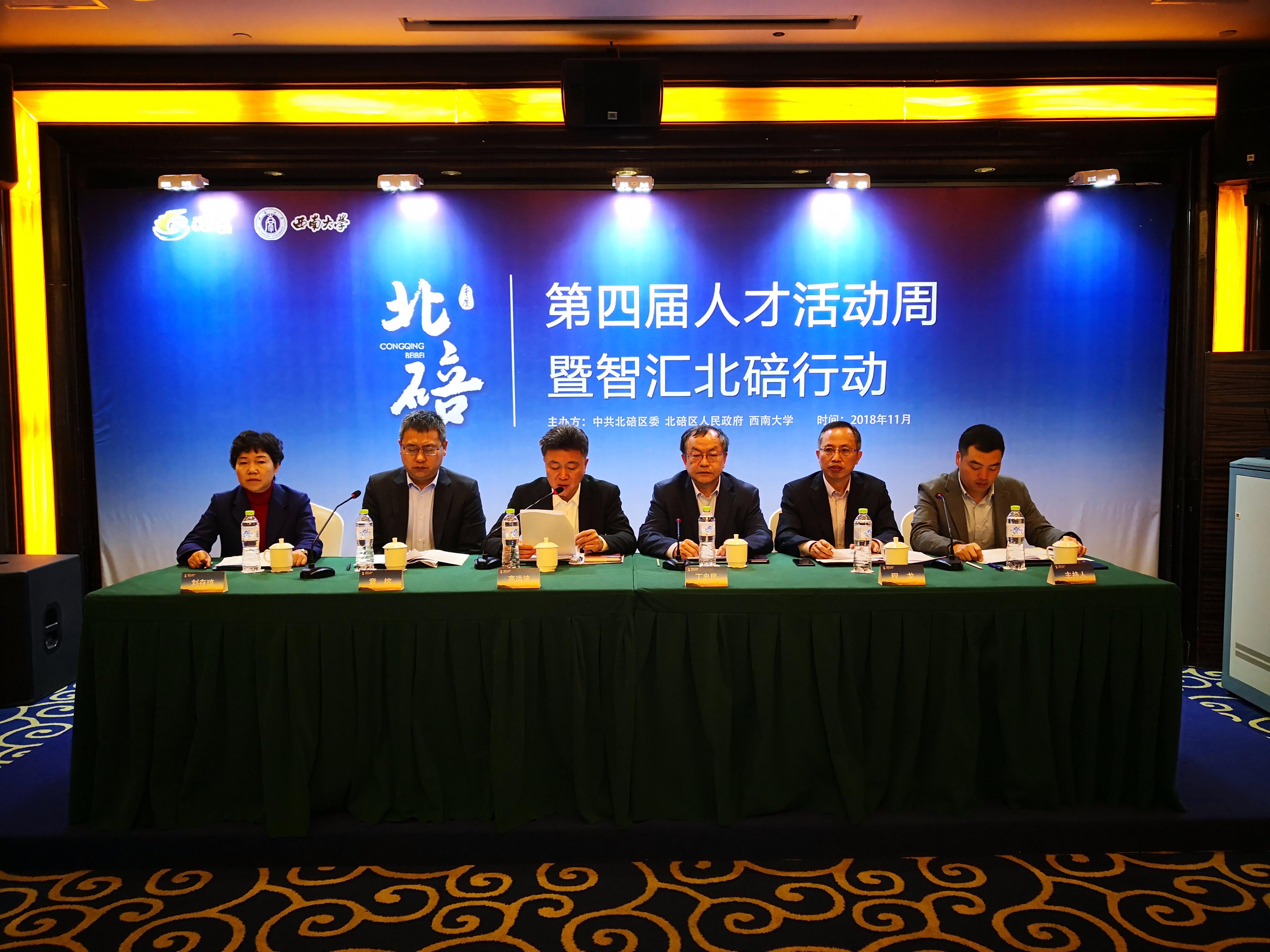 2018年11月15日,北碚区第四届人才活动周暨“智汇北碚行动”新闻发布会在北碚海宇酒店举行,学校副校长丁忠民、校地合作处处长程龙参加发布会。