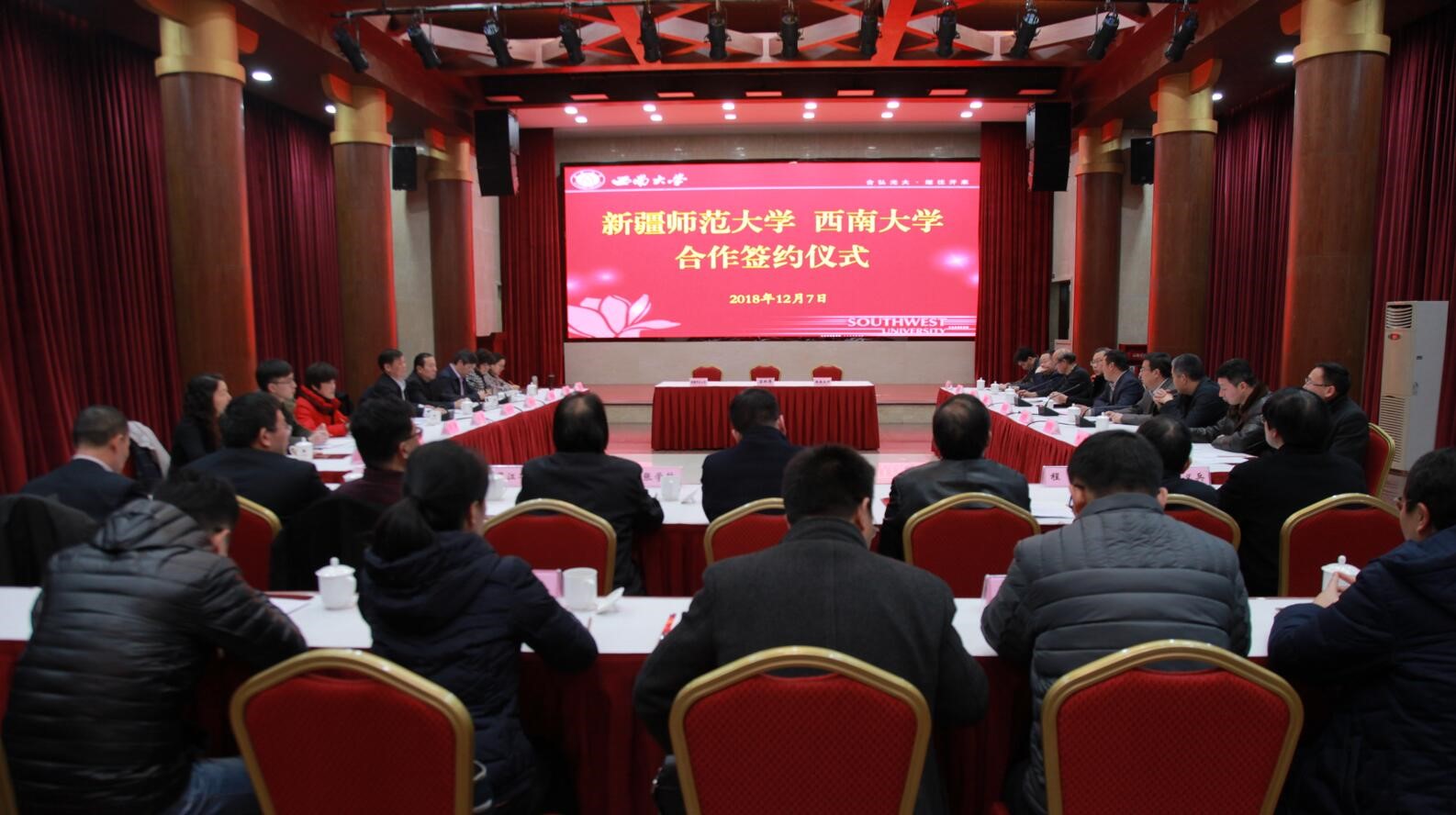 为进一步深化两校合作关系,促进两校教学科研各项事业取得长足发展,强化两校部门、学院间的交流合作,当日下午,两校在东方红会议厅举行合作签约仪式。新疆师范大学党委书记巫文武,西南大学校长、党委副书记张卫国等领导出席会议。