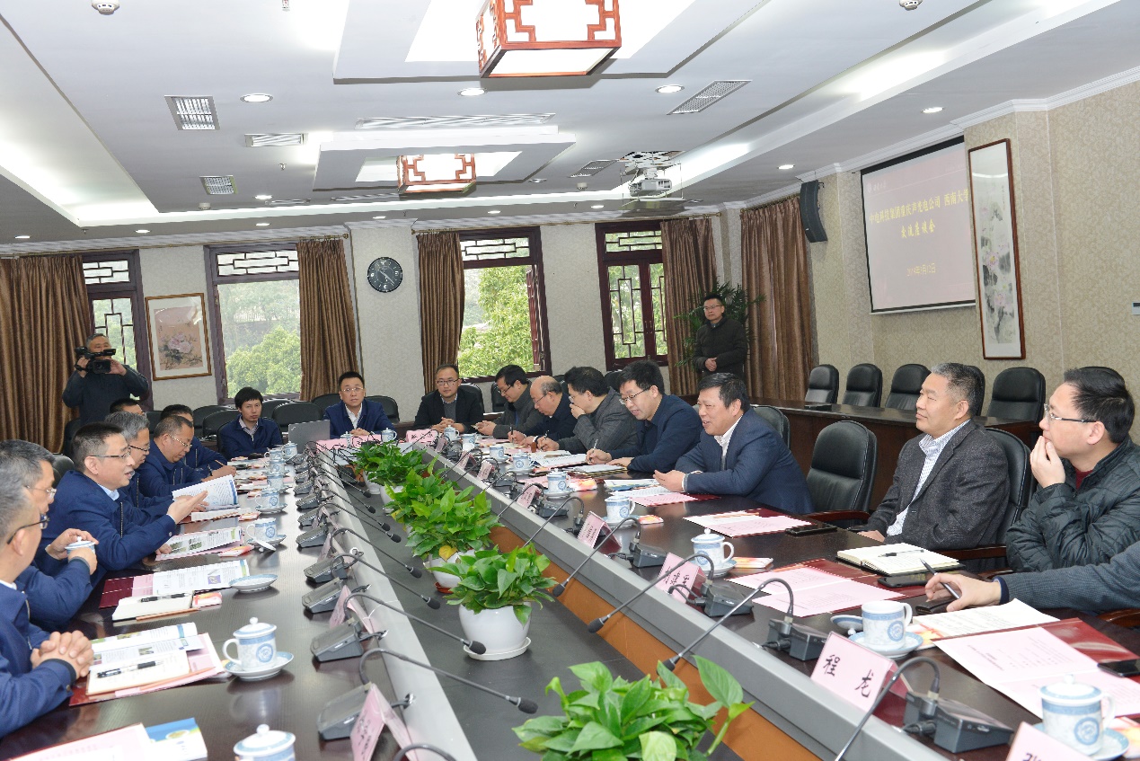 3月12日上午,中电科技集团重庆声光电公司党委书记、董事长欧黎一行13人来校交流座谈,校长张卫国出席会议。