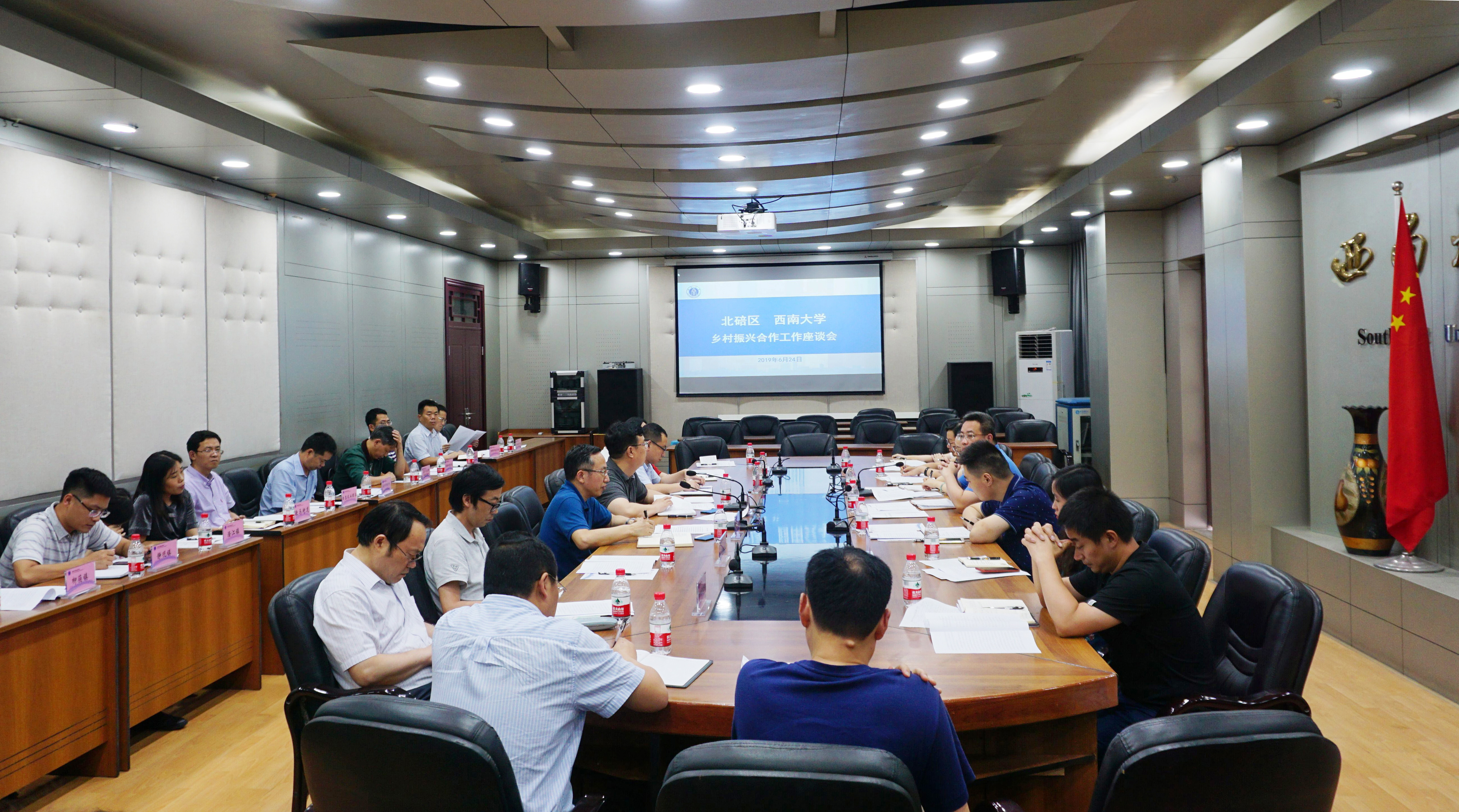 2019年6月24日,学校与北碚区乡村振兴合作工作座谈会在西南大学举行。北碚区副区长赵祺,西南大学副校长王进军出席了会议,区校双方相关部门、乡镇、学院负责人参加会议。西南大学副校长王进军主持会议。
