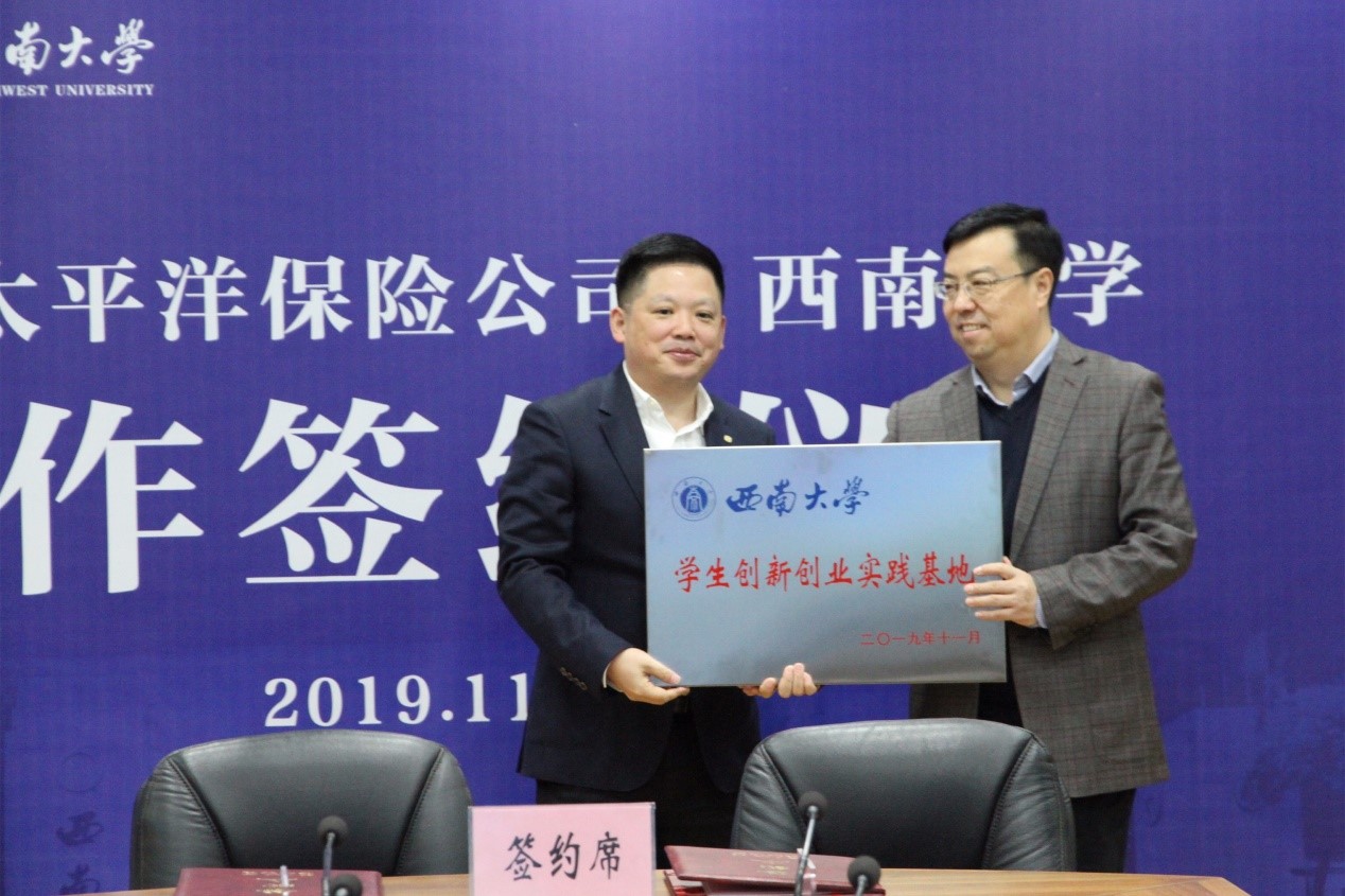 王进军副校长与赵永刚副总裁代表双方签订合作协议,并为我校在太保重庆公司设立的学生创新创业实践基地授牌。