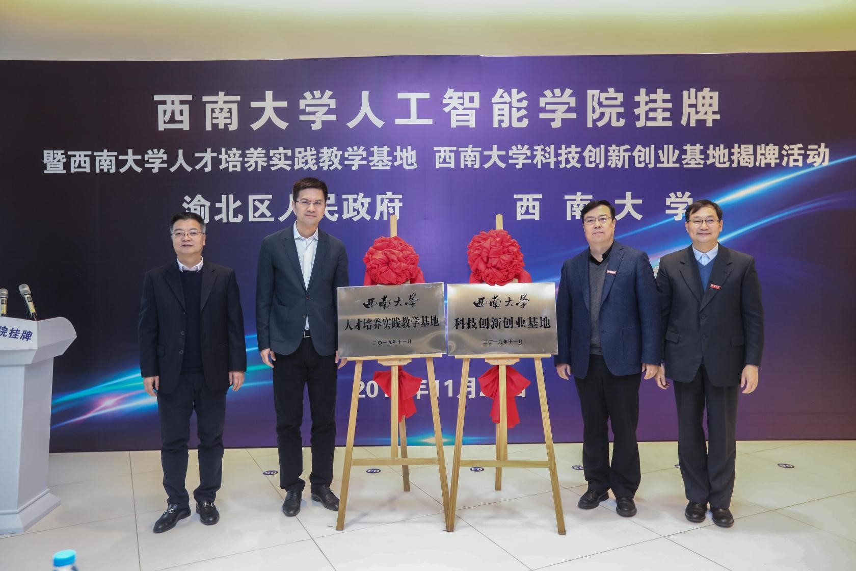 阮草副区长和王进军副校长分别代表渝北区人民政府和西南大学签订区校人工智能战略合作协议。谭庆区长和张卫国校长为西南大学人工智能学院(仙桃数据谷)挂牌。阮草副区长、王进军副校长、仙桃国际大数据谷汪小平董事长和人工智能学院段书凯副院长为西南大学人才培养实践教学基地和西南大学科技创新创业基地揭牌。