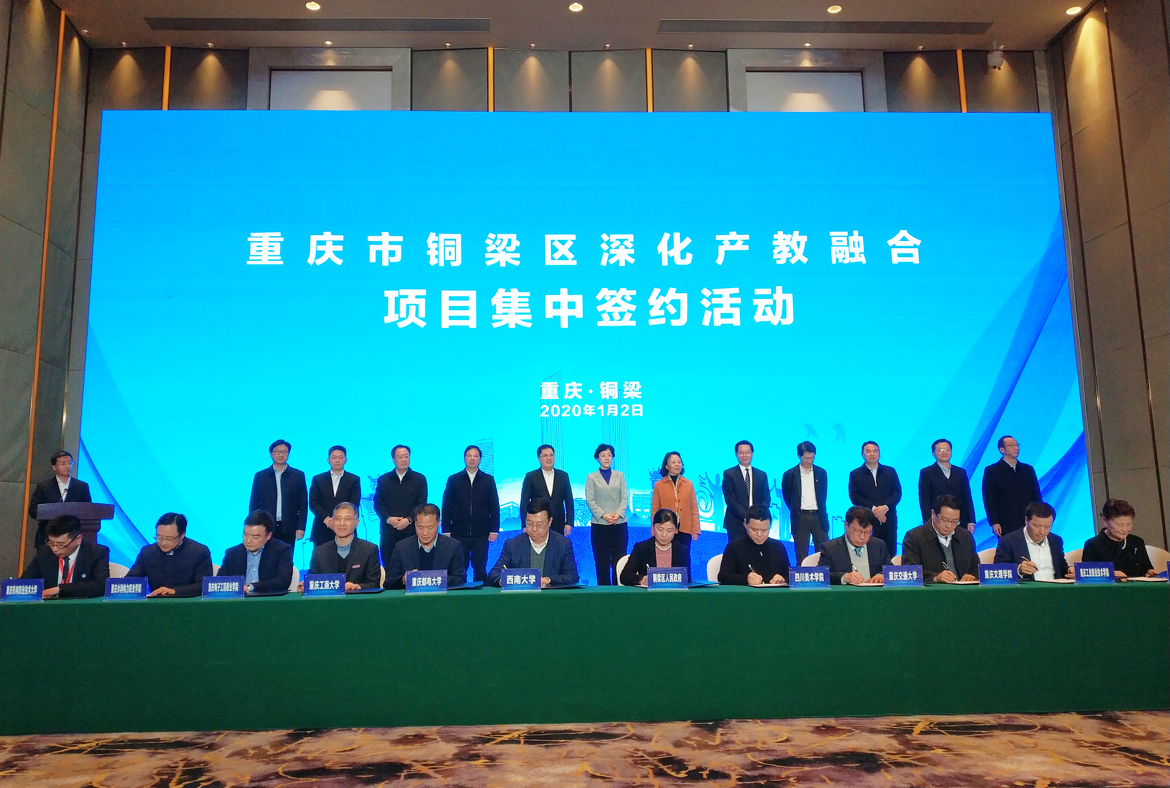 2020年1月2日,学校副校长王进军带领校地合作处处长程龙等一行应邀参加铜梁区深化产教融合项目集中签约仪式,并与铜梁区人民政府签订战略合作协议。