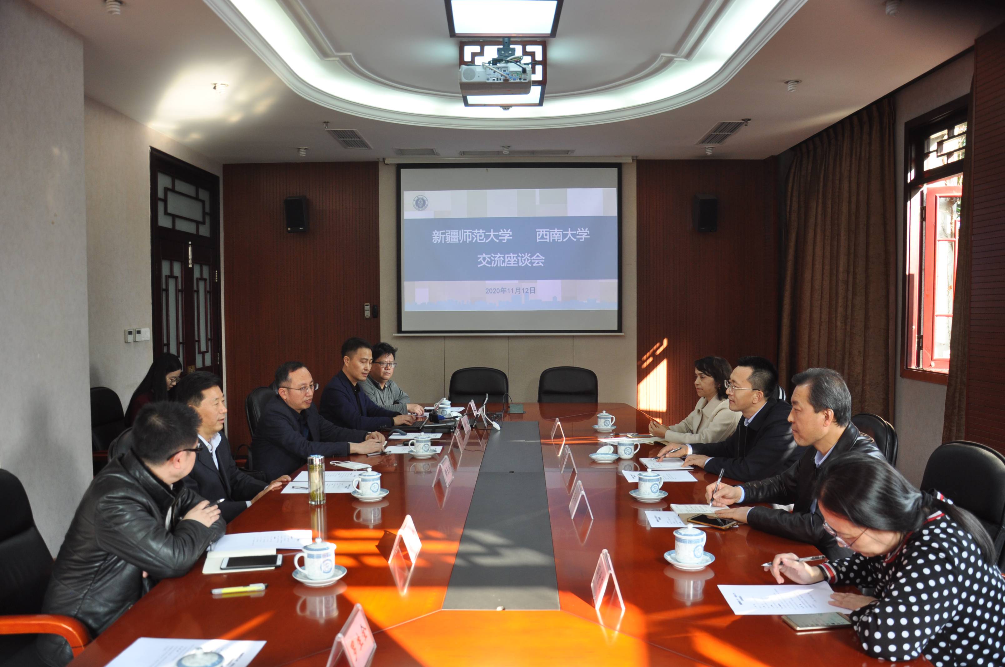 11月12日,新疆师范大学党委副书记、副校长于祥成一行来校回访援疆工作并进行调研,学校副校长靳玉乐参加交流座谈会。双方围绕援疆建设、研究生教育、学科建设、人才培养等方面开展交流。