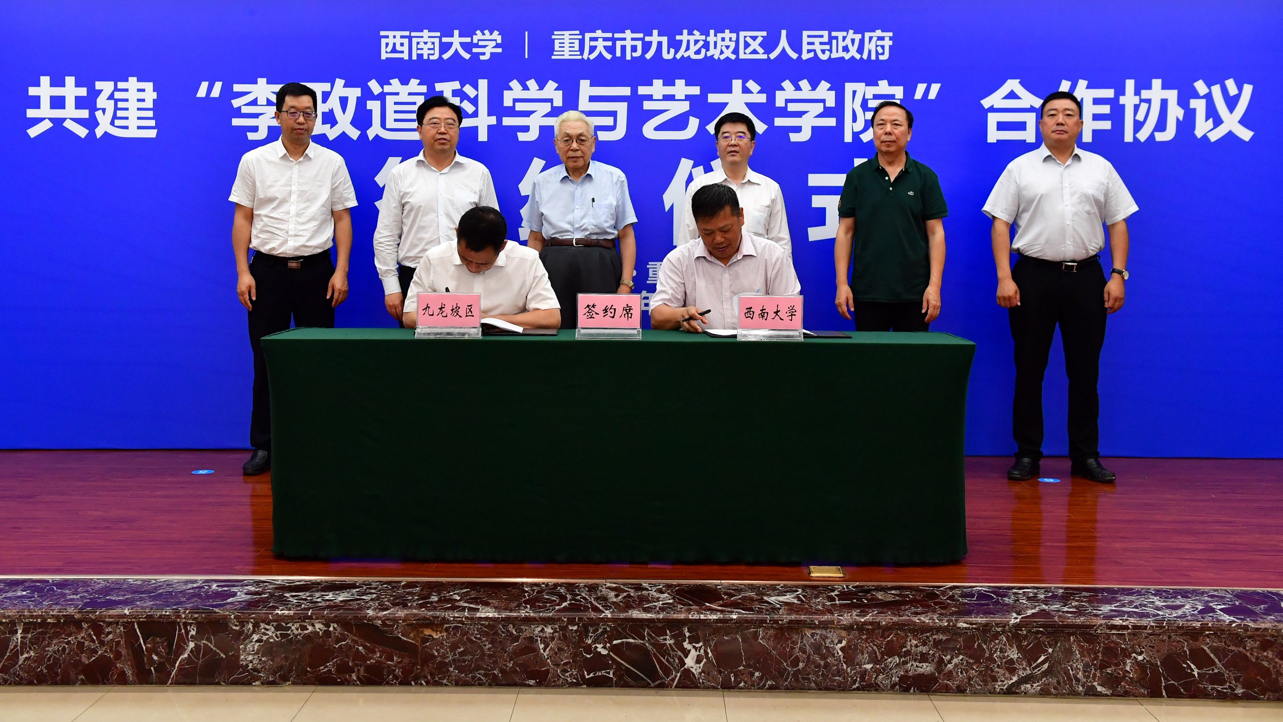 6月18日,西南大学与重庆市九龙坡区人民政府合作共建“李政道科学与艺术学院”签约仪式在九龙坡举行,中国探月工程首席科学家、中国科学院院士欧阳自远,九龙坡区区委书记李春奎、区长刘小强,学校党委书记李旭锋、校长张卫国、副校长赵国华出席签约仪式。