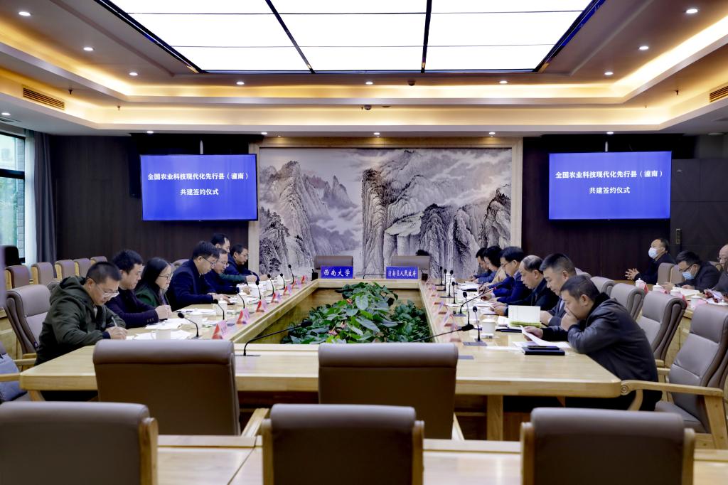会议通报了全国农业科技现代化先行县共建工作前期推进情况,审议并通过了共建方案。赵国华和罗全良代表校地双方签署了《潼南区人民政府·西南大学共建全国农业科技现代化先行县合作协议》。协议约定,“十四五”期间,区校双方将围绕全国农业科技现代化先行县创建总体要求,在农业关键技术攻关、农科教协同创新基地建设、智慧农业试验区建设、农业技术创新与服务平台建设、生态宜居乡村建设、新型经营主体培育、产业人才培养等方面开展深入合作,努力探索形成高校科技支撑县域经济发展、服务乡村振兴的新模式。