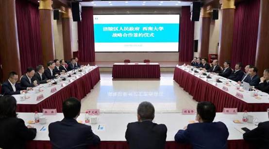 张卫国在致辞中对涪陵区领导莅临学校推进合作表示热烈欢迎。他指出,多年来,西南大学与涪陵携手共进,开展了卓有成效的合作,学校将以此次签约为契机,进一步深化区校合作,为涪陵全面推进乡村振兴、加快农业农村现代化提供技术和人才支撑。希望双方加强资源整合,充分发挥合作平台带动作用,深入开展产业技术研发、成果转化应用、人才培养培训、创新创业孵化,推动产业链、创新链、价值链深度融合。