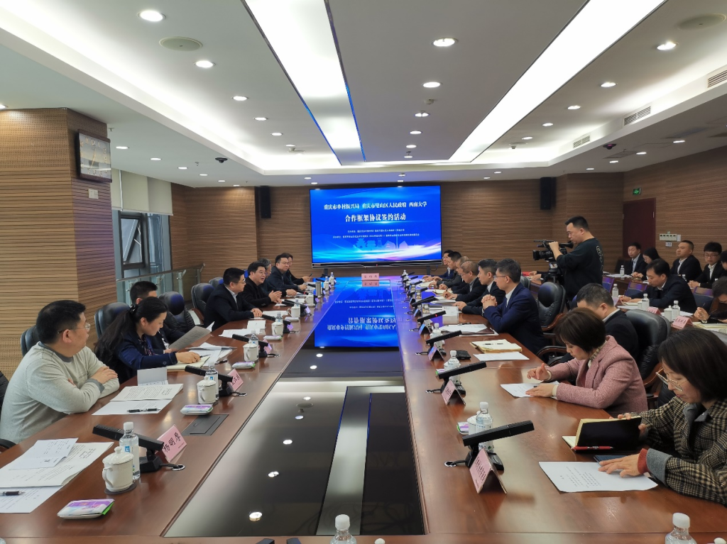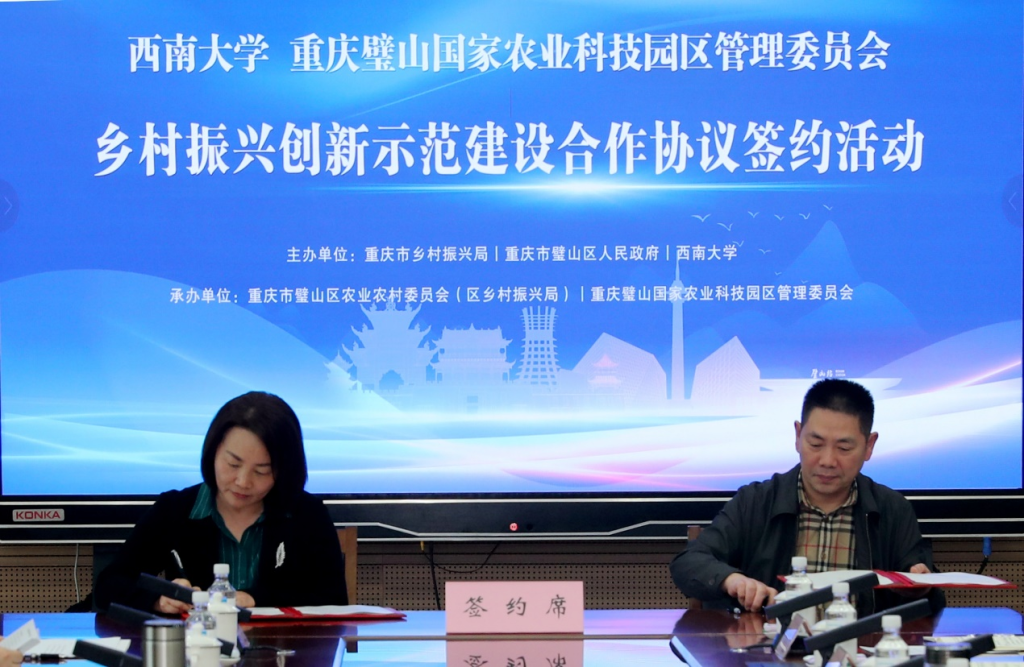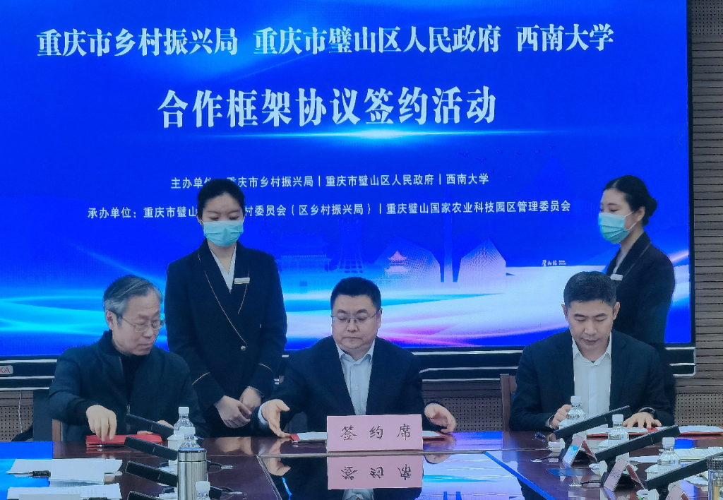 签约活动上,安春元代表学校与重庆市乡村振兴局、璧山区人民政府签署推进乡村振兴创新示范三方合作协议,学校精准扶贫与区域发展评估研究中心主任廖和平教授与璧山国家农业科技园区签订专家工作室共建合作协议。