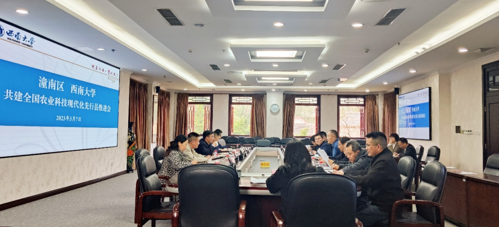 潼南区农业农村委、科技局、农投集团、旅投集团,学校发展规划与学科建设部、人力资源部、科学技术处、国内合作处、实验室建设与设备管理处、科学中心、资产经营公司等部门负责人参加会议。