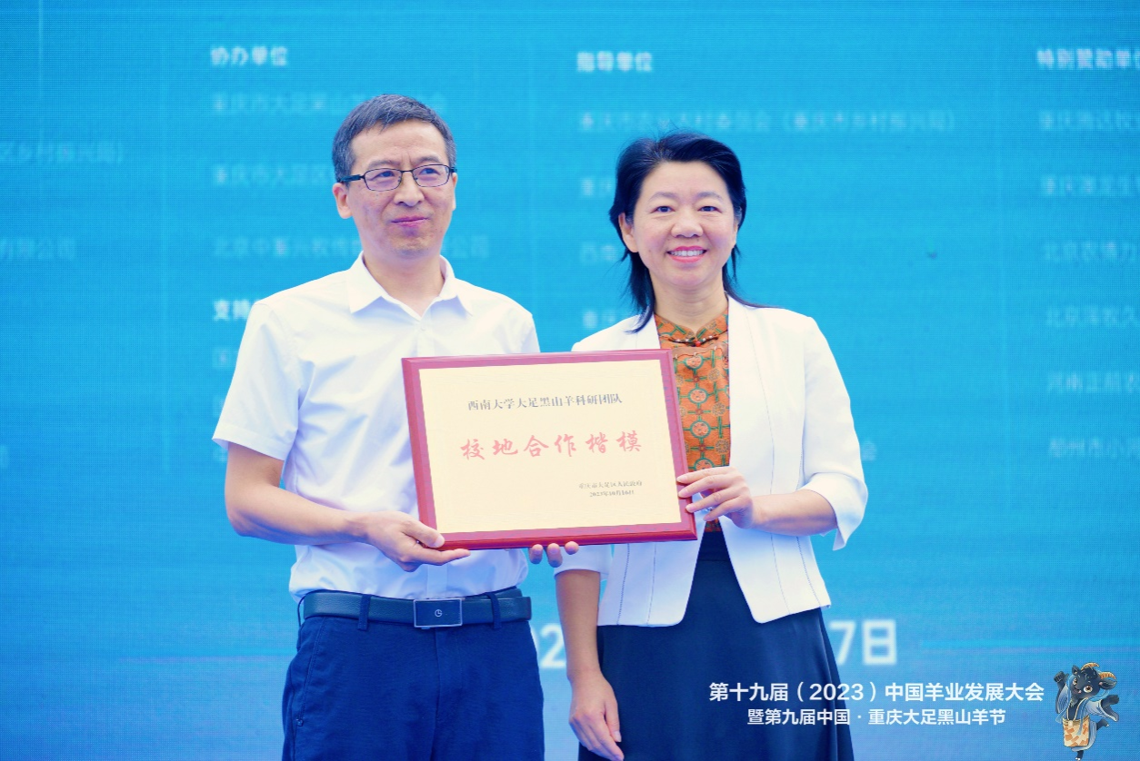 10月16日,第十九届(2023)中国羊业发展大会暨第九届中国·重庆大足黑山羊节在重庆大足区举行。会上,为表彰学校大足黑山羊专家团队为重庆市大足区黑山羊产业高质量发展作出的突出贡献,大足区人民政府授予该团队“校地合作楷模”称号,并为学校张家骅教授颁发“大足黑山羊终身荣誉首席专家”荣誉证书,为李周权、王豪举和徐恢仲3位专家颁发“大足黑山羊终身荣誉特聘专家”荣誉证书,为赵中权教授颁发“大足黑山羊首席专家”聘书。