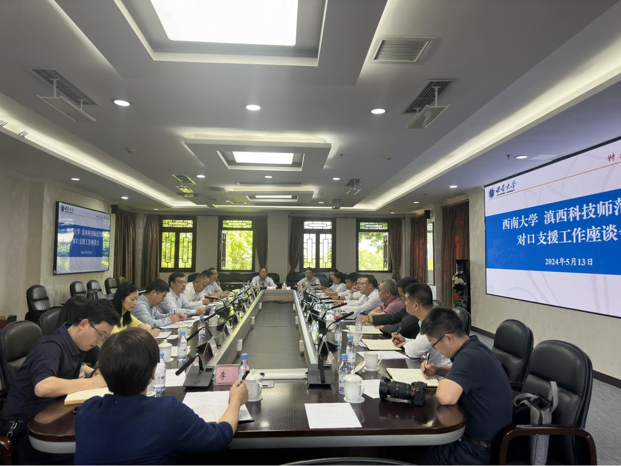 5月13日,滇西科技师范学院党委书记阮凤斌率队来校交流对口支援工作。学校校长王进军、副校长葛信勇出席座谈会,党政办公室、党委组织部、纪委办公室、教务处、社会科学处、科学技术处、国内合作处、离退休工作处等单位负责人参加座谈。会议由葛信勇副校长主持。