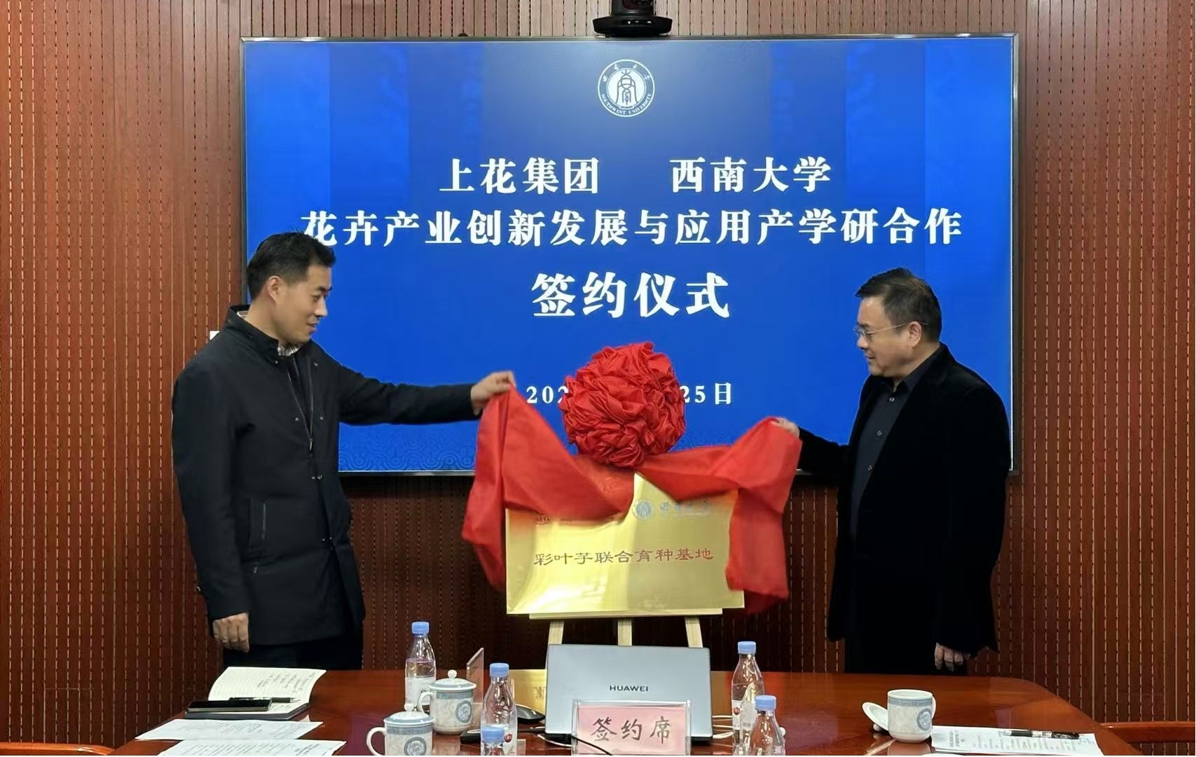 会上,双方签订了《花卉产业创新发展与应用产学研合作协议》,学院为上花集团顾俊杰副总裁、龚振德副主任颁发了西南大学硕士专业学位研究生导师聘书,白显良与施建华共同为“彩叶芋联合育种基地”揭牌。